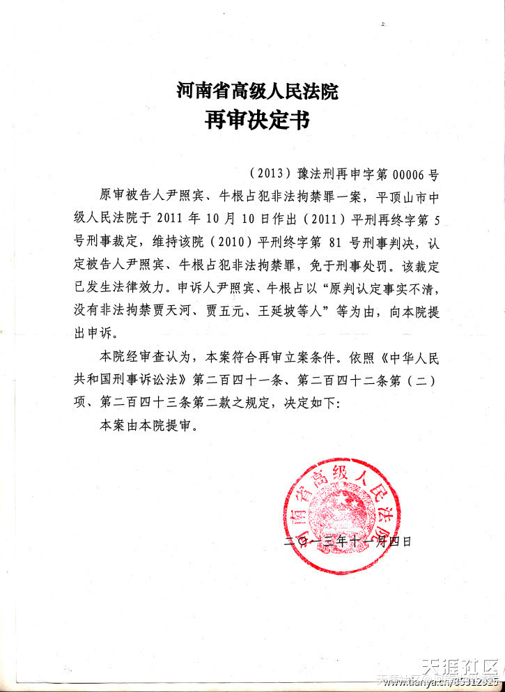 无奈 我与牛根占于2011年1月16日,向河南省高级人民法院申诉,河南省高级法院审查后认为该案符合再审立案条件,随于2011年6月9日,做出(2011)豫法刑申字第40号再审决定书,指令平顶山中级人民法院另行组成合议庭对本案进行再审。可是平顶山中级人民法院仍依旧维持原判。 (详见下面的再审决定书)