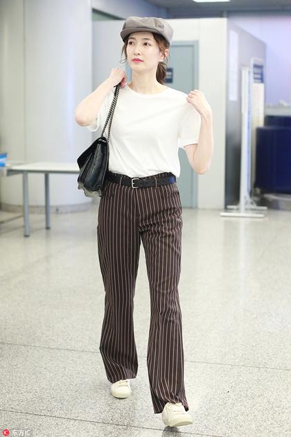 私服造型也频频以西装裤造型出镜,江疏影之前就用白TEE搭配条纹西装裤,显得知性成熟。灰色报童帽+Chanel手袋混搭小白鞋潮流时髦!