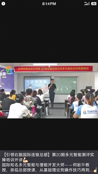 6月10日,“引领右脑”一名加盟商在朋友圈晒出了郑州总部进行的皮纹检测培训图。新京报记者 陈奕凯摄 “大师”坦承“做不到蒙眼辨色” 2017年,全脑教育机构脑立方的“蒙眼辨色”、“蒙眼识字”课程被媒体曝光,继而脑立方上海总部被上海政府部门勒令叫停。给这家曾经的全脑行业龙头企业带来非议的,正是其过于玄幻的“蒙眼辨色”课程。以脑立方的超感心像力课程为例,这门课程的标价为4.98万元,上四至五天的课,号称可以给孩子开天眼。脑立方承诺,上过课的孩子可以做到蒙着眼睛看书、扫地。 这类课程在业内被称为“超感知”,或者超五感、ESP(ExtraSensoryPerception超感官知觉,简称ESP)、HSP(HeightenedSensoryPerception高等感觉认知,简称HSP)等。此前,就有脑部研究专家明确表示,“超感知”不符合人类感知原理,没有严谨的科学证据证明其存在。 脑立方在质疑声中倒下后,“蒙眼辨色”、“蒙眼识字”之类的培训在全脑教育行业并没有绝迹,多家全脑教育机构的课程表中仍有“超感知”类课程。 北京双优贝贝全脑开发培训机构的课程体系中,针对0-6岁幼儿有ESP课程、针对稍大的儿童有HSP课程。 其总部“记忆大师”王老师介绍,这些课程并不单独开课的,而是融入到每节课当中,要经常训练。“每种颜色都有自己的温度,训练孩子感受不同颜色的温度。”王老师称,“蒙眼辨色”只是全脑潜能开发之后的一种表现,并不是全脑开发的目的。“蒙眼辨色是有争议的”,王老师坦言,自己没法做到蒙眼辨色,只是知道训练孩子蒙眼辨色的方法。 荣冠教育超强大脑培训机构的总部在云南昆明,其招商顾问张女士告诉记者,“经过松果体开发,孩子能够蒙眼看牌、看字、分辨颜色,我们叫做HSP高感知课程。” 在张女士口中,松果体开发是其他全脑开发课程的基础。“比如我们的高速记忆课程,让孩子经过4到6天培训后,看300到500字的内容,只需读一遍就能轻松背下来。这个课程必须要开发松果体,潜能的开关必须打开之后才能导入课程,以后可以把这项能力应用到任何事情上去。” 张女士称,她接触的很多客户,无法接受松果体开发等说法,“松果体的开发是比较玄的,一般人觉得蒙着眼睛怎么能看到东西,这是骗人的,但是这有科学解释的,因为人本来就有松果体,只是随着年龄增长,慢慢退化了,现在我们的课程是0-18岁才可以开发松果体。” 松果体是打开潜能的开关?北师大认知神经科学与学习国家重点实验室教授、儿童青少年脑智研究中心主任陶沙表示,松果体主要是管生物节律的,它跟感知力没有关系。