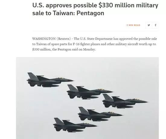 而在限制中国军事贸易的同时,美国却再次悍然对台军售。当地时间24日,美国五角大楼表示,美国国务院已批准向台湾出售F-16战斗机和其他军用飞机的相关备件,涉及金额将高达3.3亿美元。 中国外交部警告说,美方向台湾当局出售武器严重违反国际法和国际关系基本准则,损害中国主权和安全利益。 公众号“第一军情”表示,美国政府在台湾问题上的任性妄为,加上所谓专家观点和智库报告的胡言乱语,显示美国在台湾问题上的严重误判,明显低估了台湾问题对中美关系的重大敏感意义,低估了中国维护国家主权和领土完整的决心意志。